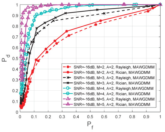 This section analyzes the impacts of different number of cooperative SUs and the number of different antennas on the spectrum sensing performance. In Figure 9, the simulation parameters are set as follows—SNR dB, , , and M is 2, 3, 4, 5, respectively.