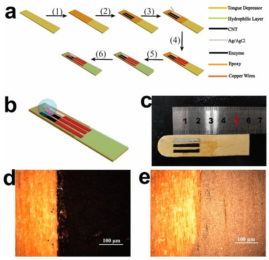 Images of the tongue depressor based amperometric sensor. (a) A schematic illustration of the preparion procedure for the sensor. Step (1): Painting epoxy; step (2): Printing carbon nanotubes (CNTs); step (3): Printing Ag/AgCl; step (4): Connecting to copper wires; step (5): Hydrophilic treatment; and step (6): Immobilizing enzymes. (b) A schematic illustration of the configuration of the sensor; (c) A camera image of the sensor; (d) An optical image of the carbon graphite electrode; (e) An optical image of the Ag/AgCl electrode.