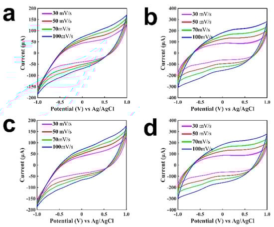 H2O2 reacts at the working electrode at a positive potential: H2O2 − 2e− = 2H+ + O2↑. From the amount of generated H2O2, the concentration of glucose can be determined. To explore the detection performance of H2O2 or glucose at different potentials, cyclic voltammetry was studied for the tongue depressor-based sensors, as shown in Figure 2. Figure 2a presents the cyclic voltammogram of the sensor for 2 mM H2O2 in the buffer. Figure 2b shows the cyclic voltammogram without H2O2 in the buffer. Figure 2c shows the cyclic voltammograms of GOD-immobilized sensor for 2 mM glucose in buffer. Figure 2d shows the cyclic voltammogram without glucose in the buffer. GOD catalyzed the oxidation of glucose to generate H2O2, which was then oxidized/reduced at the working electrode to generate a current change. From the comparison of Figure 2a,b, and from the comparision of Figure 2c,d, we can see that in the presence of H2O2 or glucose, the currents are higher than that without H2O2 or glucose at the same potential. The patterns for curves under 30 mV/s to 100 mV/s scanning rates were slightly different, as shown in both Figure 2a,c. This may be due to the different oxidation/reduction processes caused by different scanning rates, and the current is proportional to the squre root of the scanning rate. Comparing the current responses at a same potential in Figure 2a,c, it exhibits that glucose generated a smaller response than that of H2O2. This was expected, as H2O2 was oxidized/reduced directly on the electrode, whereas glucose went through the enzymatic reaction to generate H2O2, and H2O2 was oxidized/reduced on the electrode afterwards. The patterns of the curves are associated with the properties of the electronic inks, and these curves have similar patterns. As can be seen from the curves, with the increase of the potential, the current became larger. A potential of 0.6 V was chosen in this study, as this was sufficient for the oxidation or reduction process of H2O2.