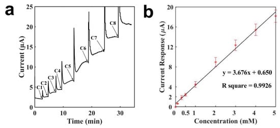 Characterization of the tongue-depressor amperometric sensors for H2O2 (phosphate buffer: 90 μL, droplet of H2O2 of different concentrations: 10 μL). (a) Current-versus-time curve for the detection of H2O2; (b) Calibration curve for the detection of H2O2. C1: 0.1 mM, C2: 0.2 mM, C3: 0.2 mM, C4: 0.5 mM, C5: 1 mM, C6: 1 mM, C7: 1 mM, C8: 1 mM.