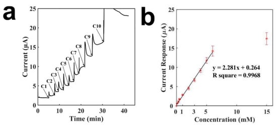 Characterization of the tongue-depressor amperometric sensors for glucose (phosphate buffer: 90 μL, droplet of glucose of different concentrations: 10 μL). (a) Current-versus-time curve for the detection of glucose; (b) Calibration curve for the detection of glucose. C1: 0.1 mM, C2: 0.2 mM, C3: 0.2 mM, C4: 0.5 mM, C5: 1 mM, C6: 1 mM, C7: 1 mM, C8: 1 mM, C9: 1mM, C10: 9 mM.