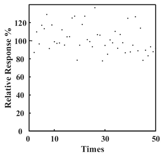 Figure 5 shows the working stability of a tongue depressor glucose sensor. The sensor was studied for measuring a same glucose concentration for more than 50 times, where 20 μL of 50 mM glucose was added to 180 μL buffer and the current response was recorded. The response of the first detection is regarded as 100%, and the following results are showed in percentages based on the first response. It can be seen that the sensor maintained an excellent response for about 90% of the initial signal after detecting glucose for 50 times. This demonstrates that the sensor has an excellent working stability for the detection of glucose continuously.