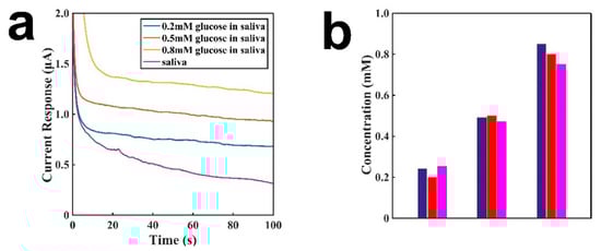 Figure 6 shows the comparison between tongue depressor amperometric sensors and a spectrophotometer. The actual concentrations were 0.2 mM, 0.5 mM, and 0.8 mM. Figure 6a show the graph of the sensor for detecting the concentration of glucose in saliva. Different concentrations of glucose in 200 μL of saliva were dropped onto the electrode surface. After the addition of glucose and waiting for 5 min to decompose glucose into H2O2, the concentration of H2O2 became uniform on the electrode in saliva, and the current baseline was detected for 100 s at 0.6 V. As shown in the figure, the signal is well correlated with the concentration of glucose. The glucose’s concentration in saliva was derived from the calibration curve in Figure 4. Figure 6b shows the comparision of the detection performances by using the sensor (pink) and a spectrophotometer (blue). The blue is the result from a spectrophotometer. As shown in the figure, both methods show comparable results, which are about the same as the standard concentrations of glucose. These results demonstrate that the sensor is an effective detection tool for measuring glucose concentrations in saliva.