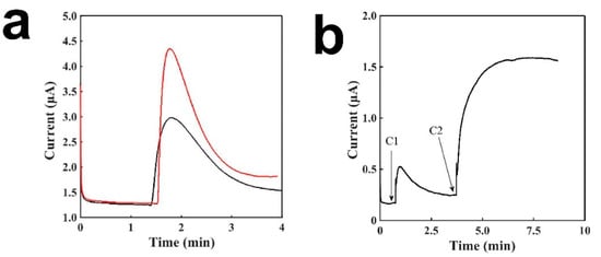 Characterization of the tongue depressor amperometric sensors for saliva. (a) The signal of the sensor with enzyme to H2O2 (red) and glucose (black). A total of 5 μL of 10 mM glucose solution was added to 195 μL of artificial saliva; (b) The signal responses to two different concentrations of glucose in saliva, C1: 0.048 mM and C2: 0.714 mM.