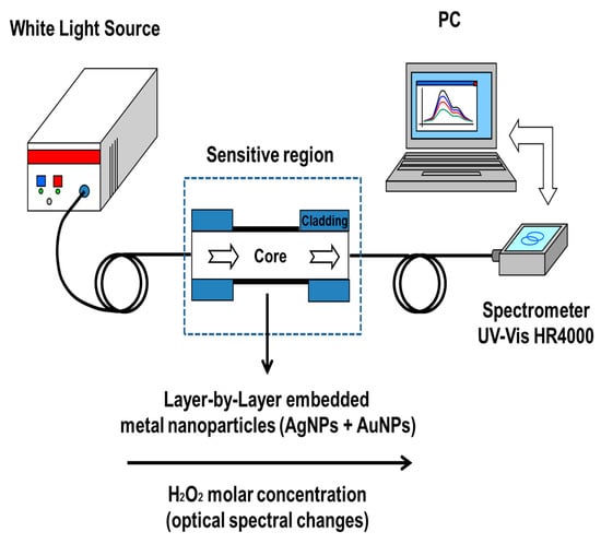 - Hu, X.; Tao, S. An optical fiber H2O2 -sensing probe using a titanium(IV) oxyacetylacetonate immobilized nafion coating on an bent optical fiber probe. IEEE Sens. J. 2011, 11, 2032–2036. [Google Scholar] [CrossRef]