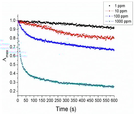 - Endo, T.; Shibata, A.; Yanagida, Y.; Higo, Y.; Hatsuzawa, T. Localized surface plasmon resonance optical characteristics for hydrogen peroxide using polyvinylpyrrolidone coated silver nanoparticles. Mater. Lett. 2010, 64, 2105–2108. [Google Scholar] [CrossRef]