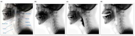 - Logemann, J.; Kahrilas, P.; Begelman, J.; Dodds, W.; Pauloski, B. Interactive computer program for biomechanical analysis of videoradiographic studies of swallowing. Am. J. Roentgenol. 1989, 153, 277–280. [Google Scholar] [CrossRef] [PubMed][Green Version]