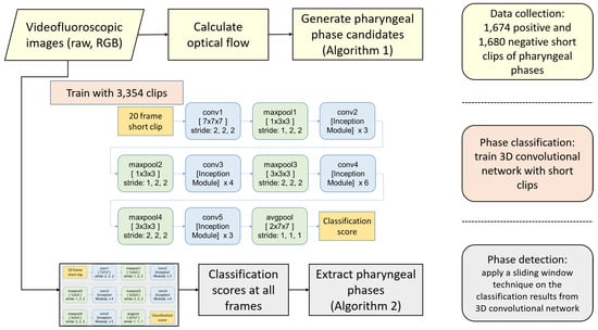 To objectively assess VFSS image data, researchers have attempted to develop software tools for the clinicians who analyze VFSS [,,]. To apply these tools, clinicians are required to provide specific time intervals of the pharyngeal phase and to annotate the region-of-interest (ROI) defined in a frame-by-frame analysis []. In this study, we aim to improve the labor-intensive procedures involved in analyzing VFSS images. We propose a novel system that automatically detects the pharyngeal phase of a swallowing process in raw VFSS video clips.