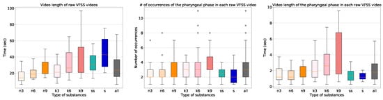 The box-plots of the video length of the raw videofluoroscopic swallowing study (VFSS) videos, the number of occurrences, and the video length of the pharyngeal phases in each raw VFSS video (from left to right). On the horizontal axes, n, k, ss, and s indicate thin liquid, thick liquid, semi-sold, and solid, respectively. The labels 3, 6, 9 indicate the amount of substance used in the experiment in milliliters.