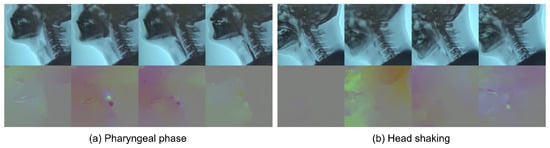 RGB (top) and optical flow (bottom) visualization of (a) positive sample—pharyngeal phase; and (b) negative sample—other action (e.g., head motions due to coughing).
