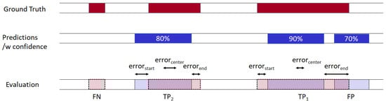 A sample evaluation process is shown in Figure 5. There are three occurrences of the pharyngeal phase in the ground truth, and our algorithm predicted three occurrences with confidence score. In the evaluation process, the detection with the highest confidence score searches the ground truth time predicate which has not yet been chosen by another detection and has the highest IOU value (>threshold). Any ground truth which is not predicted by the algorithm is counted as an FN, and a predicted detection which could not find an unmatched ground truth is counted as an FP. For all TPs, we measured errors at the start, middle, and end of the time predicates.