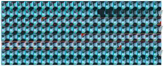 Detection results on a raw VFSS video. The detected occurrences of the pharyngeal phase are indicated by the red colored right angle bracket. From a total of 4103 frames, 160 frames are selectively displayed.