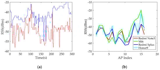 An experiment is carried out in a conference room to analyse the influence of heterogeneous smartphones on RSS. Two heterogeneous smartphones are used to measure the RSS data from the same AP and location. A total of 300 RSS data are collected within 5 min at a frequency of 1 Hz. Figure 1a shows the results. Differences in the RSS values are observed when heterogeneous smartphones are used, and the average difference of RSS data collected by two heterogeneous smartphones over a period of time is approximately 8 dBm.