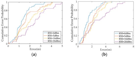 Comparison of positioning performance for different methods under heterogeneous and the same smartphones: The cumulative error probability represents the cumulative probability of absolute error of each TP. Fingerprint data are collected with the Redmi 5plus smartphone in the offline phase, and the test data are collected with different smartphones in the online phase: (a) Redmi 5plus and (b) Honor 9.