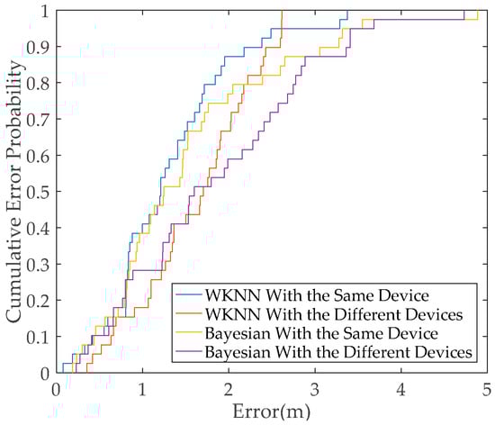 A new experiment is designed to further verify the influence of heterogeneous smartphones on positioning accuracy. The experimental setting is the same as that in Section 2.2. The RSS data are collected by using two heterogeneous smartphones in the offline and online phases. The WKNN and Bayesian algorithms are used for positioning in this experiment. In Figure 3, the test results show that the positioning performance of the WKNN algorithm using the same smartphone outperforms the WKNN algorithm when heterogeneous smartphones are used. The positioning performance of the Bayesian algorithm using the same smartphone also outperforms the Bayesian algorithm when heterogeneous ones are used. Accordingly, the positioning performance of conventional methods is not ideal and presents degradation when heterogeneous smartphones are used in the offline and online phases.