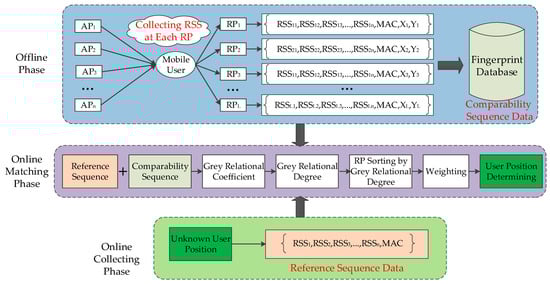 In this work, our approach consists of three phases, namely, offline, online collecting, and online matching phases. Firstly, a fingerprint database is developed by using the RSS data collected at each RP. Secondly, the online RSS data are collected at a TP. Finally, GRC and GRD between reference and comparability sequences are calculated and the user location is determined. Each phase is explained in the following sections.