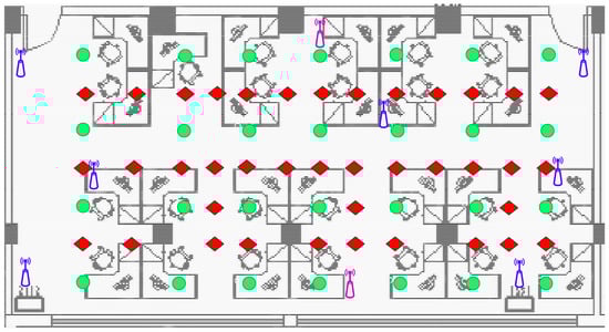 Experiment settings for indoor positioning: The green, circular symbols represent reference points (RPs), and the red, diamond symbols represent test points (TPs).