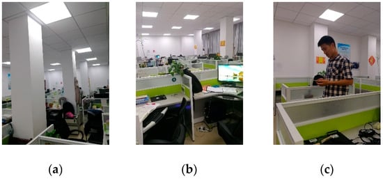 On the software side, the RSS data are collected by a smartphone application developed by our research team. We perform the same setting in the process of collecting RSS data at each TP and RP. Four heterogeneous smartphones are used to collect the RSS data at a rate of 1 Hz. Table 1 shows the Wi-Fi modules from the four heterogeneous smartphones. Smartphones from distinct brands usually have different Wi-Fi modules from various manufacturers. In addition, various smartphone models from the same brand may have different Wi-Fi modules. The antenna positions of each smartphone may be different in smartphones of distinct brands. In order to eliminate the effect of body shadowing on positioning, the RSS data are collected from four different orientations: east, west, north, and south. The RSS data are collected in each direction for 15 s for a total of 60 s (60 RSS data) at each RP and TP. When RSS data are simultaneously collected from four heterogeneous smartphones at each TP and RP, each smartphone is in the hand, held at chest level, and maintains the same pose in the experimental scene of Figure 6. For convenience, an independent coordinate system is established in the office for positioning.