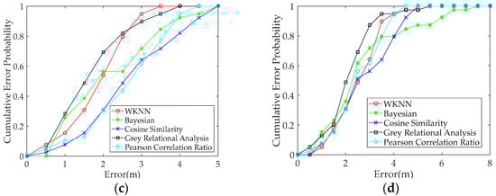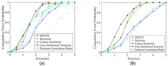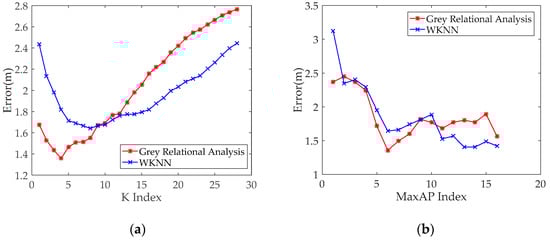Figure 7a shows that the mean errors of all TPs are calculated by the WKNN and proposed method and that the error changes with the K value. Figure 7a demonstrates that the positioning error shows a decreasing trend with the increase of K. The positioning error gradually increases when it is reduced to a certain extent. Accordingly, the positioning results of K = 4 and K = 8 are optimal with the GRA and WKNN algorithms in the office scenario, respectively.