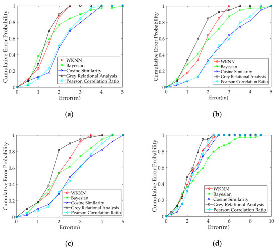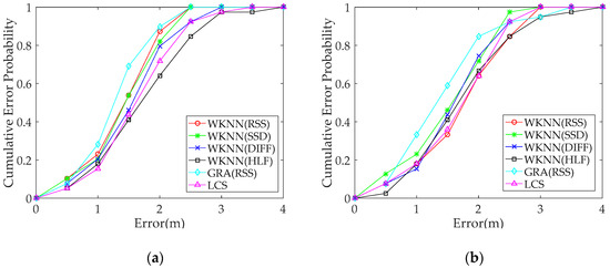 The positioning performance of the proposed GRA-based method is compared with those based on RSS difference when the same and heterogeneous smartphones are used. The RSS data from Redmi 5plus are used as fingerprint data. By contrast, the RSS data from the Honor 9 and Redmi 5plus smartphones are used as the test data. Here, we illustrate the proposed method based on GRA and other existing methods, including DIFF, SSD, and HLF, based on RSS difference. The WKNN algorithm is selected to estimate positioning performance. The RSS method is added for comparison, which only uses raw RSS data. The positioning performance of the proposed method based on GRA is evaluated by comparing the positioning performance of various preprocessing methods based on RSS difference. In addition, the LCS method is compared with other methods, which uses only relative relationship information among RSS values.