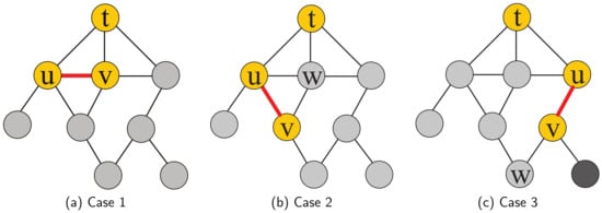 The goal of our UpdateCloseness algorithm is to update the shortest paths of the nodes which is affected by removing an edge and avoid recomputing closeness value by traversing the entire network. In this section, we propose a simple example to illustrate the principle of our UpdateCloseness algorithm. Suppose that we have a network , leader t and its BFS tree  in Figure 3, we attempt to remove an arbitrary edge  in the network and . By observing the BFS tree , we investigate that there are three edge deletion cases as follows: