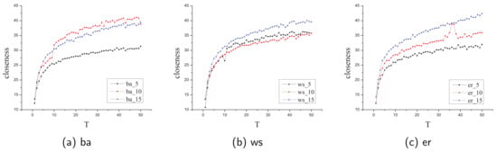 Figure 4 shows the average speed up ratio in different sizes and kinds of randomly generated networks. Regardless of the size and kind, our UpdateCloseness algorithm is always faster than the original BFS algorithm and the speed up ratio gradually increases as the network sizes () increases. In most cases, the speed up ratio tends to depend on  and we confirm that our algorithm works well in complex networks.