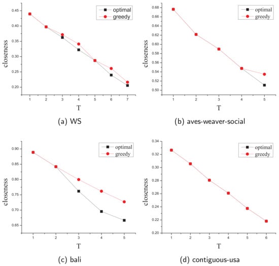 Figure 5 shows the differences between the optimal solution and greedy approximate solution in each budget k ( due to limited space, we only choose four typical results in all networks ). Obviously, our approximate greedy algorithm can significantly minimize the closeness value of the leader in seconds compared with nearly 2 days to obtain the optimal solution by brute-force search when the budget .