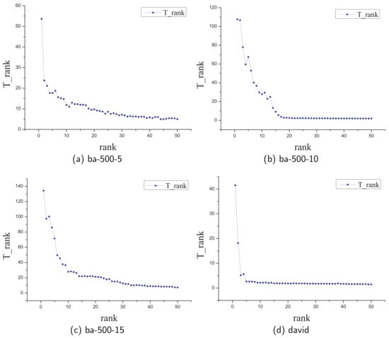 In this experiment, we compute the rank of the nodes ranking from 1 to 50 in the network by two algorithms for three times and take the average to compute the speed up rate . Figure 7 shows the results in different networks. Obviously, our algorithm can significantly reduce the time when computing the top-5 nodes and it still works when computing the nodes with low rank.