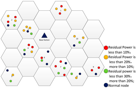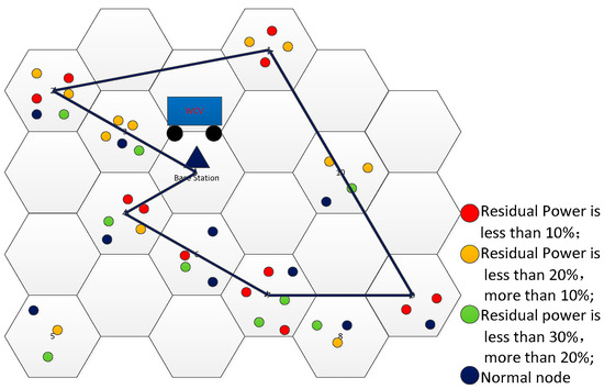 After choosing optimal charging nodes, clusters which have sleep sensor nodes are recorded. In the next charging round, the values of harmonic coefficients in Equation (4) during prior cluster selection are changed. This change should ensure that the cluster with sleep nodes has more chance to be selected. After the WCV enters a cluster with the sleep node, the tradeoff between the charging efficiency and the lifetime of the sensor node is considered during the optimal charging sensor node selection. We define the weight of optimal charging sensor node selection as , where different goals can be achieved through adjusting the value of the harmonic coefficient . When has a larger value, the residual energy is a main influence of selection. This means that the WCV prefers to choose the life-critical node to ensure the connectivity of network. To further illustrate the ENDRS strategy, we provide an example in Figure 5.