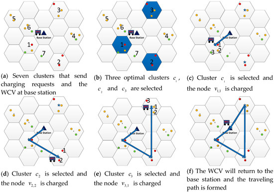 To illustrate Algorithm 1, we use an example shown in Figure 3. Assume that there are five to-be-charged clusters in the network at some time point (see Figure 3a). First, we calculate the distance between each cluster and the base station, and sort the distance in ascending order which is . The nearest cluster is first selected (see Figure 3b). Then we calculate the distance of the remaining clusters from the cluster , and the order is . The cluster is selected since it is closest to the cluster (see Figure 3c). Similarly, the remaining clusters are selected one by one (see Figure 3d,e). Finally, after charging cluster (see Figure 3f), the WCV will return to the base station to recharge itself. A charging tour according to the nearest neighbor algorithm is formed.