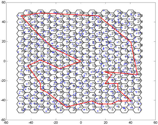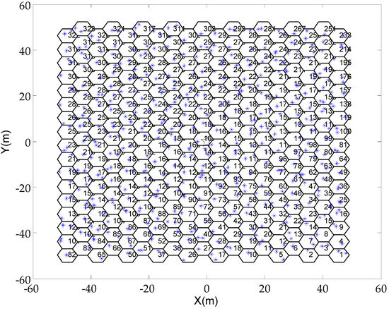 We assume that each cell contains a random number of sensor nodes, and define as the density of the sensor node. The density of the sensor node is defined as the maximum number of sensor nodes in a cell, e.g., . When the density of the sensor node increases, the total number of sensor nodes in the network also increases. By using MATLAB software, a network scenario in which the density of the sensor node is 2 are generated, which is shown in Figure 6.