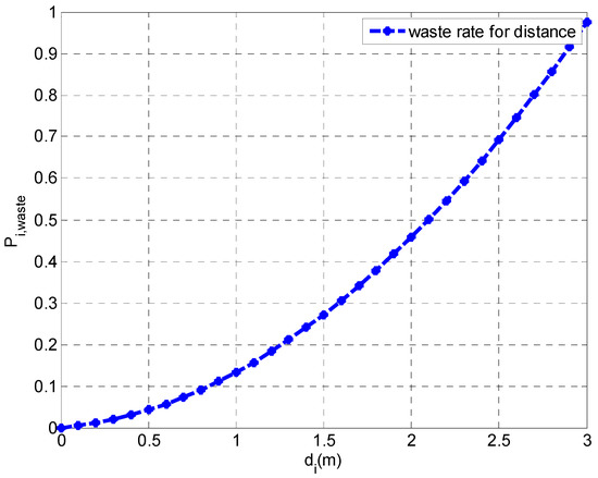 The result in Figure 7 indicates that the energy waste rate increases with the increasing of the distance, which is consistent with Equation (14). In order to decrease the waste rate, the distance between the sensor node and the WCV should be short as much as possible. Furthermore, this one-to-one correspondence relationship makes the distance be replaced by the waste rare during parameter setting of the simulation.