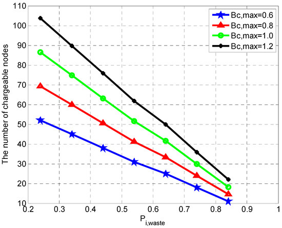 From Figure 8, it can be found that the number of chargeable sensor nodes increases with the decreasing of the energy waste rate or the increasing of the capacity of the WCV. This phenomenon can be explained by using Equation (11). Take the right side of the equation, the number of chargeable sensor nodes is , where represents the energy actually used. The original formula is changed into: , where .