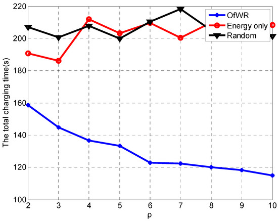 Furthermore, we compare the charging time when the WCV can charge for 25 sensor nodes in a round. The variation of total charging time in terms of the density of the sensor nodes is shown in Figure 10.