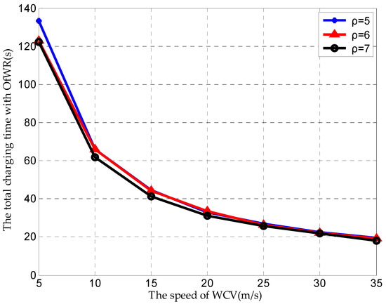 Finally, we observe the total charging time varying with the speed of the WCV under different densities of the sensor node, and the result is in Figure 11. The result in Figure 11 shows that the total charging time decreases with the increasing of the speed of the WCV, and the difference among different densities of the sensor node is not obvious. This result indicates that the total charging time can be decreased through increasing the speed of the WCV, and when the speed of the WCV is more than 20 m/s, the proposed algorithm can achieve the almost same performance of the charging time under a smaller density of sensor node.