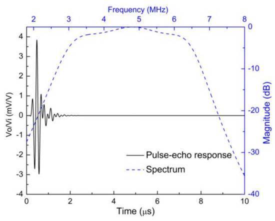 The designed 5 MHz transducer showed a center frequency of 4.73 MHz after putting the backing and matching layers with a −6 dB bandwidth of 77.38% (corresponding to the lower and upper −6 dB frequencies of 2.90 MHz and 6.56 MHz). The center frequency and −6 dB bandwidth for the designed 10 MHz transducer were 9.61 MHz and 77%, respectively (corresponding to the lower and upper −6 dB frequencies of 5.91 MHz and 13.31 MHz). These simulation results agreed well with the experimental results.