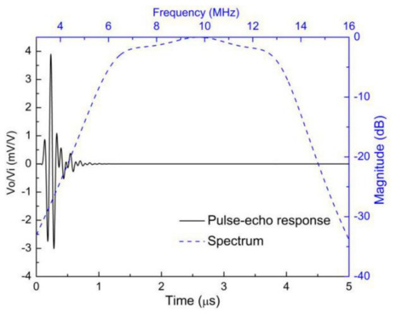 The modeled pulse–echo response and the FFT spectrum of the 10 MHz transducer.