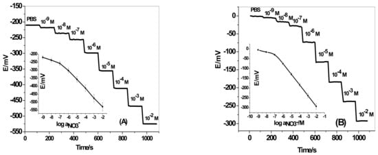 Solid-contact nitrate sensors based on nitron+/NO3− ion-association that were plasticized in o-nitrophenyloctyl ether (NPOE) were prepared and characterized. The composition of the sensor membrane was: plasticizer = 49 wt %, nitron+/NO3− = 2.0 wt %, and PVC = 49.0 wt %. The potential of the developed ISEs was recorded over the concentration range 1 × 10−8–1 × 10−2 M KNO3. The potential readings versus log aNO3− are presented in Figure 1. The slopes calculated from the linear range of the calibration plots of the nitrate-selective electrodes with/without MWCNTs were −55.1 ± 2.1 (r2 = 0.9973) and −53.1 ± 1.4 (r² = 0.9995) mV/decade over the linear range of 8.0 × 10−8–1 × 10−2 and 1.0 × 10−7–1 × 10−2 M, respectively. The detection limits of these sensors were 2.8 × 10−8 (1.7 ng/mL) and 4.7 × 10−8 (2.9 ng/mL), respectively. All potentiometric characteristics for all investigated electrodes are presented in Table 1. A stable response was obtained over the pH range 3.5–10. So, phosphate buffer solution (30 mM, pH 5) was chosen for all nitrate measurements. From the presented results, it can be demonstrated that the insertion of a MWCNT layer as an ion-to-electron transducer has no effect on the potential performance characteristics of the solid-contact ISE. As shown in Figure 2, the reversibility test of the studied ISEs is presented. GC/MWCNTs/NO3−-ISE showed enhanced potential reversibility towards NO3− ions. The response time of the GC/MWCNTs/NO3−-ISE was very short (<5 s). It can be deduced that the removal of the inner filling solution favors the response time of the solid-contact electrode.