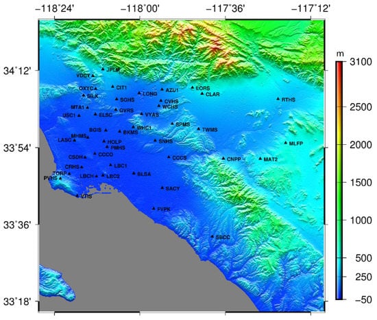 The GPS data were downloaded from the Southern California Integrated GPS Network (SCIGN, http://www.scign.org). The SCIGN has built more than 250 GPS continuous observation stations to monitor real-time three-dimensional surface deformation in southern California. 45 GPS continuous observation stations with a uniform distribution in the study area were selected for this experiment (Table 2). And the distribution of the GPS stations is shown in Figure 2. Since InSAR can only measure one-dimensional deformation in the LOS direction, in order to allow a comparison, the three-dimensional deformation measured by GPS was projected into the LOS direction. The projection formula used is as follows:
