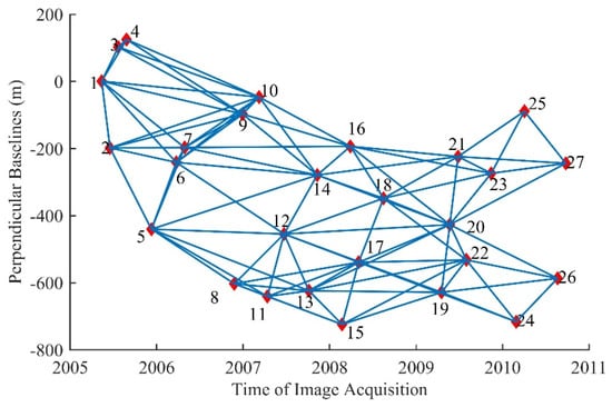 (1) InSAR data processing. The image of November 10, 2007 was selected as the main image, and other images were registered in the main image coordinate system. A total of 96 interference pairs were obtained with perpendicular baselines shorter than 200 m and temporal baselines shorter than 300 days. The spatial–temporal baseline distribution is shown in Figure 4. The interferometric SAR processor (ISP) module of GAMMA software was used to process the selected interference pairs, and SRTM data were used as an external DEM to eliminate the terrain phase. In order to suppress noise, multilook operations of 2 pixels in range and 10 pixels in the azimuth direction were conducted. Furthermore, an adaptive interferogram filtering algorithm was applied to the multilook interferogram with a 32 32 patch size window and 0.5 filter parameter []. After that, the minimum cost flow (MCF) algorithm with Delaunay triangulation network was used for phase unwrapping.