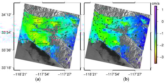 InSAR mean LOS deformation velocity map for southern California for the period from 14 May 2005–25 September 2010 (unit: cm/a). The base image is a grayscale SAR image. (a) The classical SBAS-InSAR result. (b) The GACOS-based SBAS-InSAR result.