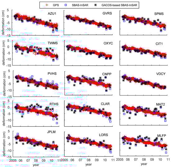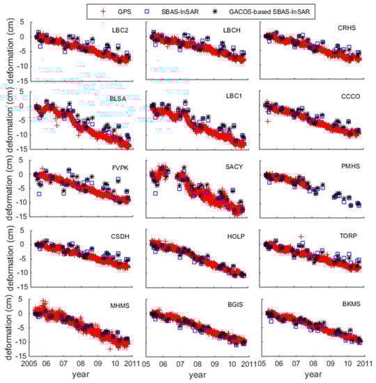 The time-series deformations of 15 points in the low-altitude region, which were obtained using SBAS-InSAR and GACOS-based SBAS-InSAR, are compared with GPS in the LOS direction in Figure 6. The deformation shown by SBAS-InSAR and GACOS-based SBAS-InSAR in Figure 6 was relatively consistent with that given by GPS points, although the fitting degree of the GPS stations LBC1 and BLSA points after GACOS correction decreased and the GPS station TORP points were more consistent with GPS deformation. It can be seen from the quantitative analysis in Table 4 that the difference between SBAS-InSAR and GPS was −0.53 cm/a to 0.41 cm/a for low-altitude points, and the mean square error was 0.40 cm/a. The difference between GACOS-based SBAS-InSAR and GPS was −0.61 cm/a to 0.29 cm/a, and the mean square error was 0.39 cm/a. In Table 4, seven points after GACOS correction had a reduced rate difference between GACOS correction and GPS, and six points, marked in red, showed an increased rate difference. The biggest error caused by GACOS was at GPS station SACY, and the error value was 0.23 cm/a.