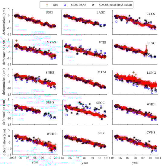 In order to verify the corrective effect of GACOS atmospheric products in time-series InSAR and to further analyze whether altitude had an impact on the corrective effect, we compared GACOS-based SBAS-InSAR, classical SBAS-InSAR, and GPS projected in the LOS direction, and have briefly evaluated the corrective effect of GACOS atmospheric products and the detection accuracy of the GACOS-based SBAS-InSAR method.