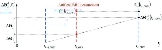 In the integrated navigation system, the estimation of the reference system errors (INS) is possible due to the GPS receiver, which provides a redundancy of the measurement data. The process of integration, however, requires bringing INS and GPS measurements to a common moment of time and a point in space, which is neglected in solutions presented in the MOCO literature [,,] but is considered in the method presented in this paper. The data synchronization was achieved by interpolating results obtained at a higher frequency [from the inertial measurement unit (IMU)] to the time of data obtained at a lower frequency (GPS data). In this method, an additional (artificial) IMU measurement was generated at a GPS data time (), and then it was placed between two standard IMU measurements (taken at and ). Considering the high IMU update rate (1 kHz) and the low dynamics of the UAV, the specific force vector was interpolated using a zero-order polynomial, as it was assumed that the specific forces remained constant during a single measurement period: