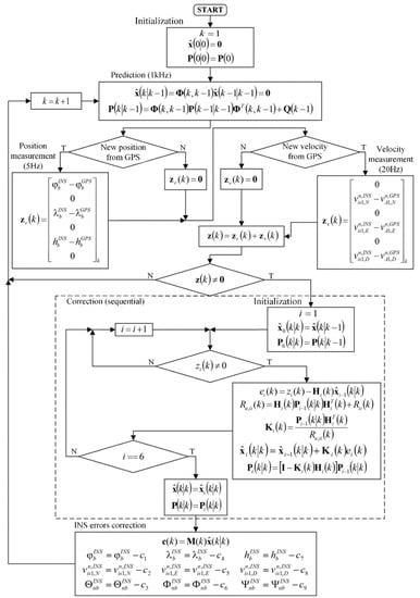 An algorithm of sequential Kalman filter used in the proposed system consisted of four stages: initialization, state prediction, measurement update, and reference system (INS) correction (Figure 2). In the initialization phase, the initial values of the system state vector elements were assumed to be zeroes, since the INS was initialized using the GPS data with zero-mean errors. Moreover, the initial value of the covariance matrix was determined using the formula [,]: