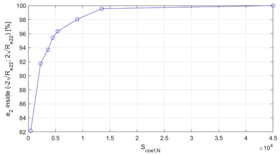 Table 2 shows the influence of the scaling coefficients on the vector statistical parameters. The highlighted rows represent the results obtained with the use of the coefficients from Table 1. In this experiment, the influence of each coefficient was tested separately. Moreover, to give a better insight into the effects caused by changes of these coefficients in a wider ranges, Table 2 contains a more detailed analysis of the system sensitivity to the , which is also presented in Figure 3 for a chosen element of the vector, namely, . The results presented in this figure show that the number of samples lying within the range increased monotonically with the increase of the coefficient, asymptotically tending to 100%. Similar behavior was also observed for other coefficients and the residual vector elements.