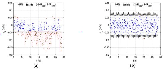 During this procedure, the values of and matrices were modified in order to obtain the conformity of the statistical parameters of the residual vector , which was a realization of a stochastic process of innovations and the theoretical parameters in the innovations process []. In the optimal Kalman filter, the innovations vector has a normal distribution with a zero mean []. The diagonal elements of the matrix represent the variances of the process components. According to the normal distribution properties, 95.5% of samples for each component of the residual vector should lie within a range defined by ±2 standard deviations of the innovations process .