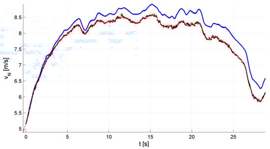 During a test campaign, the whole SAR system—which was named WATSAR [,] and was designed by the authors, among others—was tested in flight for various UAV trajectories and for various system configurations. Detailed results of those tests were presented in [,,,,]. Apart from the online data processing, which was realized in our system, both radar and navigation data were registered for the post-mission offline processing. Chosen results of this offline processing of IMU and GPS data with the use of our Kalman filter are presented in Figure 5 and Figure 6. The results of calculation or estimation of one velocity component (along the north axis) and one position component (along the vertical axis) were selected as representative for the results obtained for all axes.