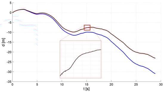 In case of the matrix, the tuning procedure was applied to the power spectral densities of the IMU accelerometers and gyroscopes noises given in Equation (43). Common scaling coefficients , , were used for accelerometers and gyroscopes for each axis. In the case of the matrix, the scaled parameters were the variances of the GPS position and the velocity errors given in Equation (51). One common coefficient was used for all the position errors, and one coefficient was used for the velocity errors. Firstly, and were determined, as they were connected with the GPS system performance, which could be assumed to be repeatable in similar testing conditions. Then, further tuning was performed using matrix coefficients. The values of the coefficients established in the tuning procedure are presented in Table 1.