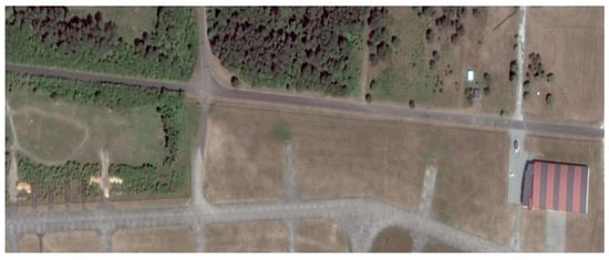 In the case of the image obtained without MOCO (Figure 15), it was not possible to determine the SR, the PSLR, and the ISLR parameters due to significant image distortions, which hindered distinguishing individual corner reflector. As in the previous example, however, the INS/GPS-based MOCO was more effective in the reduction of the geometric distortions than the INS-based method. In the INS/GPS image, the shape of the taxiway is closer to the true one due to the fact that the north edge of the taxiway in the INS image deviates to the north. Moreover, the shape of the hangar visible on the right (east) side of the INS/GPS image is rectangular, while in the INS image, it is distorted and becomes trapezoidal with a visible nonlinearity of its southern edge.